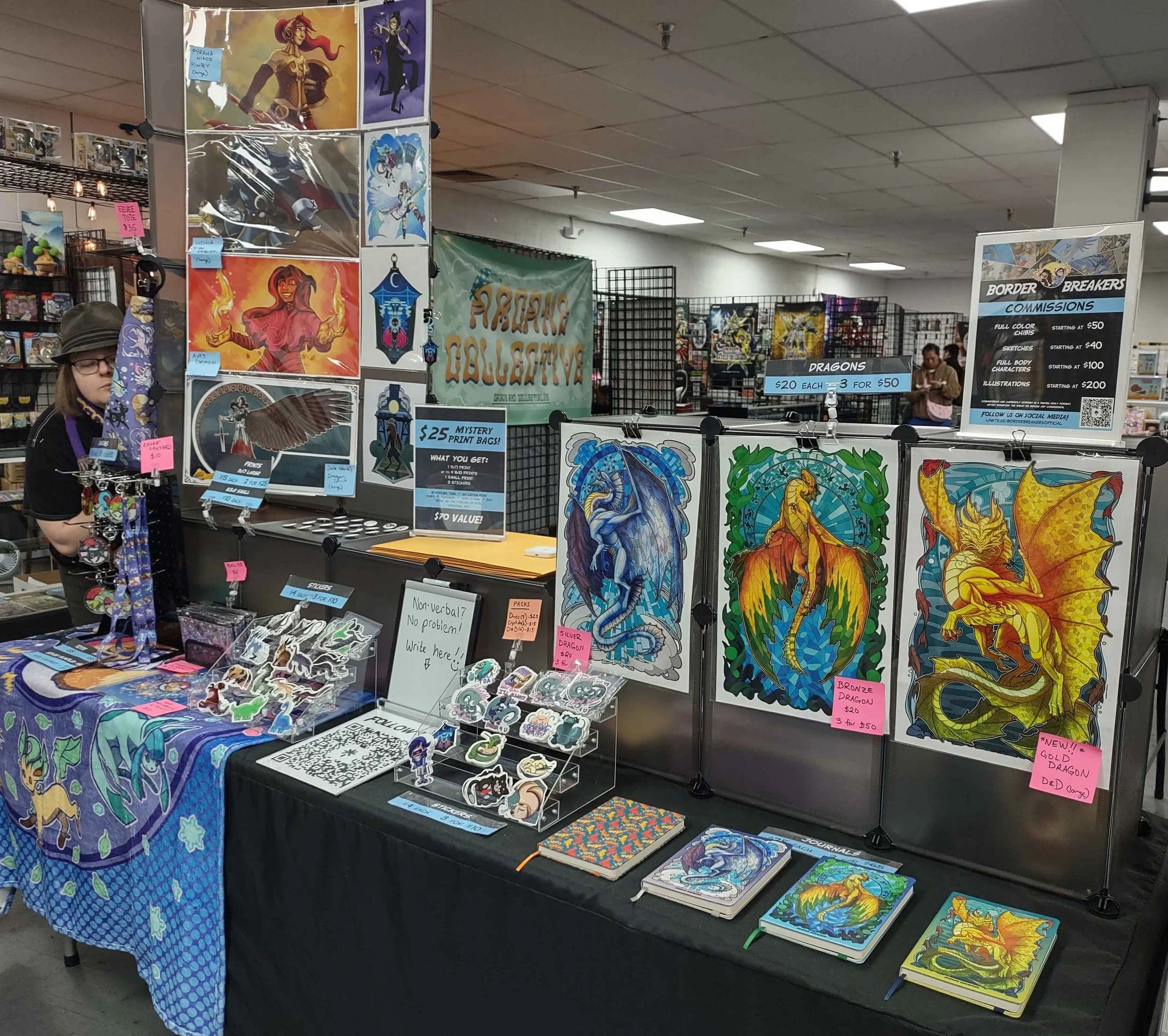 Current merchandise: prints, stickers, acrylic charms, pencil cases, lanyards, journals, blankets, totes